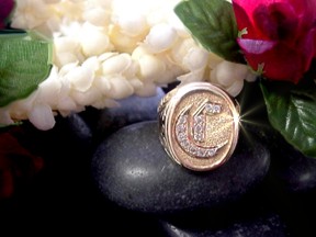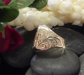 Engraved with one initial with a touch of Hawaii. Hand engraved scroll  enhances each side of the ring.