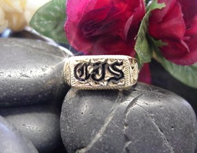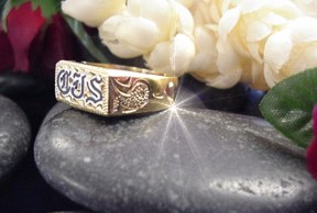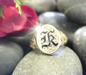 Engrave with three initials enhanced with Hawaiian engraving one each side. Initials  filled with Glass Enamel. Heavy weight.  Perfect for a ring finger or pinky ring.