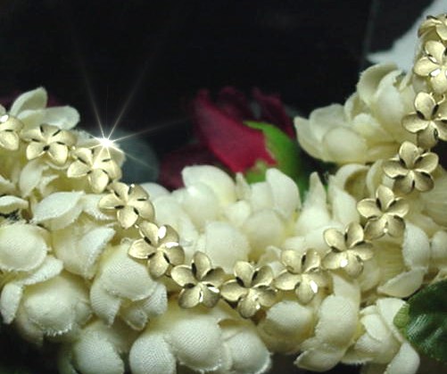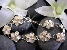 Each Plumeria Blossom is linked and soldered together creating this Lei of Aloha Bracelet. Plumeria's with satin finish and shiney borders. Flowers approximately 9mm in diameter and 7" in length.